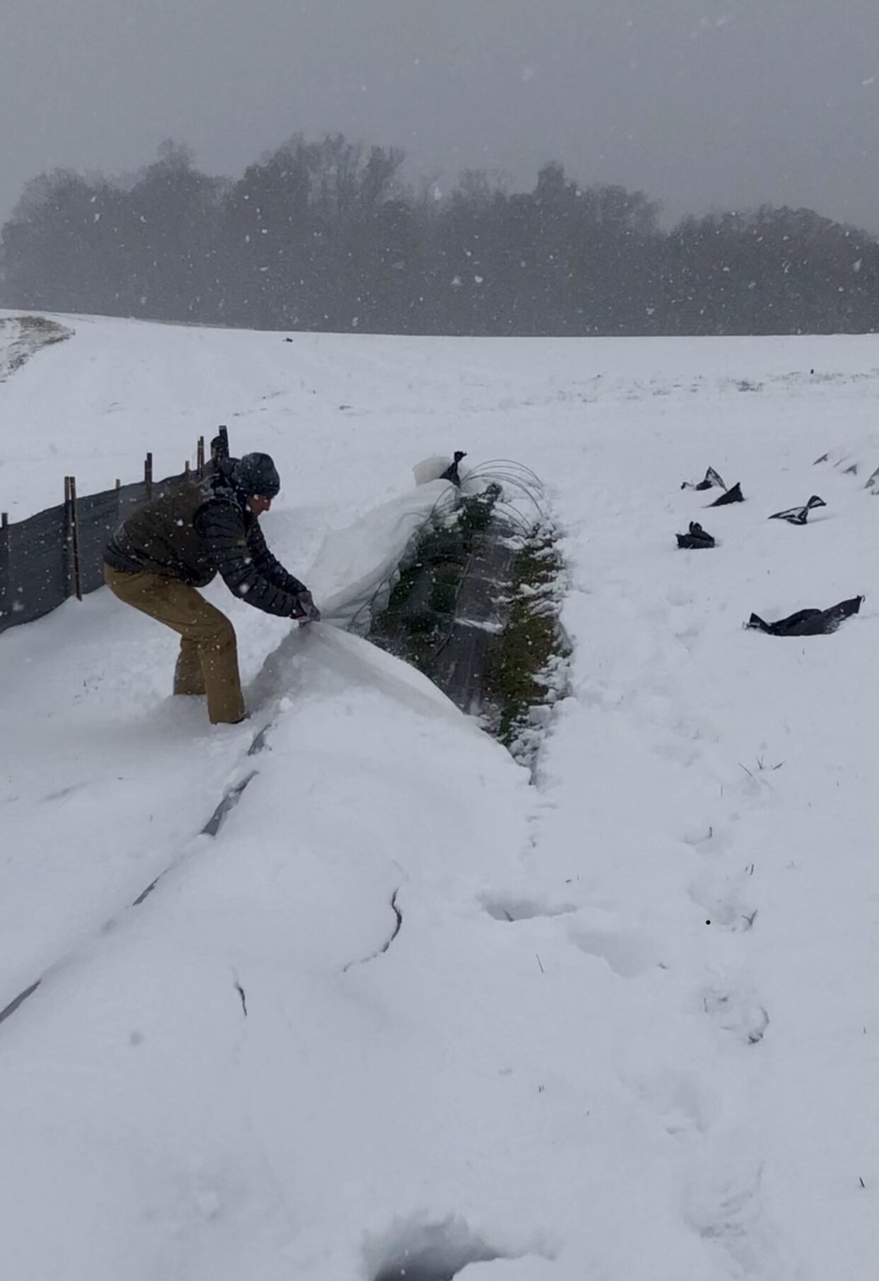 Once the fields are covered, we can’t just walk away. We continue to monitor the temperature and the condensation. So many of our storms here in Maryland are combinations of snow and freezing rain. The weight of this condensation requires us to go out in the fields every few hours and physically shake off the snow and ice so the wire frames don’t bend and break the plants.